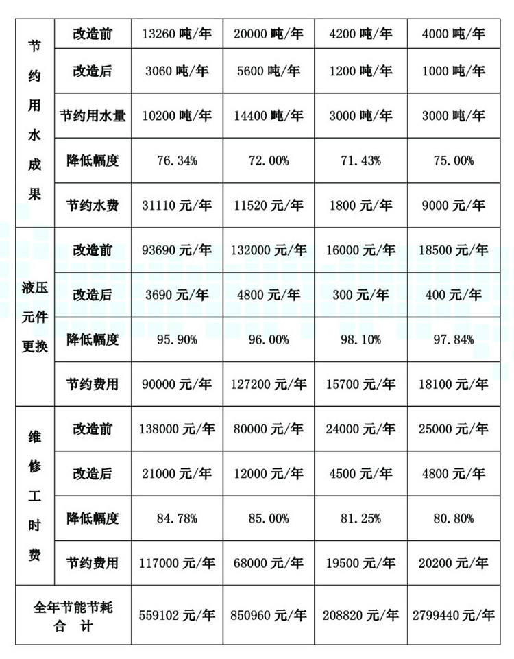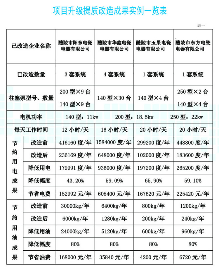 該系統(tǒng)的研制成功和應(yīng)用,基本解決了電瓷、陶瓷企業(yè)制泥壓濾系統(tǒng)長(zhǎng)期存在的主要問(wèn)題,其優(yōu)點(diǎn)體現(xiàn)在: 1、節(jié)電55%/年以上; 2、節(jié)水75%/年以上; 3、可節(jié)油80%/年以上(液壓油使用周期可達(dá)5年以上更換一次); 4、設(shè)備故障率及液壓元器件耗損明顯降低,維修維護(hù)人工工資可節(jié)省80%/年以上,液壓元器件購(gòu)置費(fèi)用可降低90%/年以上; 5、由于系統(tǒng)壓力保持恒定,極大地改善和提高了泥料和產(chǎn)品質(zhì)量; 6、有效地改善了工作場(chǎng)所的環(huán)境污染,陶瓷液壓柱塞泵液壓系統(tǒng)高度集成一體化,減少占地面積,徹底改變了原來(lái)柱塞泵周?chē)?、水橫流的臟、亂、差現(xiàn)象; 7、有效提高了安全操作性,有效避免了因人為將壓力調(diào)整不當(dāng)所帶來(lái)的油缸炸裂等設(shè)備安全事故和人身安全的隱患。 8、綜合效益顯著、投資小、見(jiàn)效快,每套系統(tǒng)的投資,大多數(shù)企業(yè)可在6-8個(gè)月內(nèi)收回。