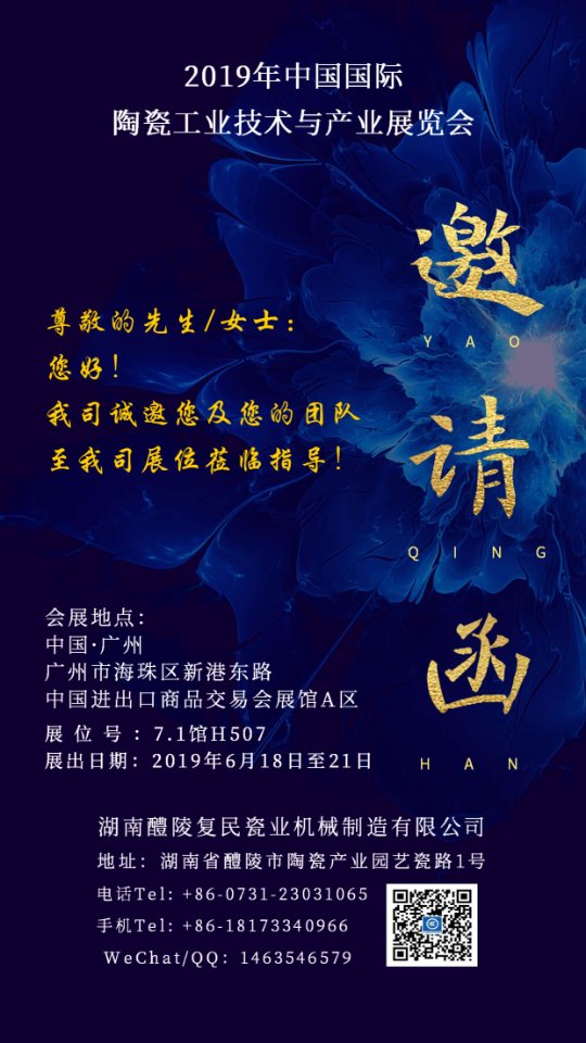 尊敬的客戶: 您 好! 我司于2019年6月18日-6月21日在廣州市中國(guó)進(jìn)出口商品交易會(huì)展館A區(qū)參展,本次參展將推出我司自動(dòng)化設(shè)備。非常感謝您對(duì)我們公司長(zhǎng)期以來的大力支持,值此陶瓷工業(yè)技術(shù)與產(chǎn)業(yè)展覽會(huì)到來之際,我們?cè)诖苏嬲\(chéng)的期盼您的參觀,恭候您的光臨。 您的到來希望給我們提供一些好的參考和建議,我們的成長(zhǎng)與發(fā)展離不開每一個(gè)客戶的指導(dǎo)與關(guān)懷。謝謝!