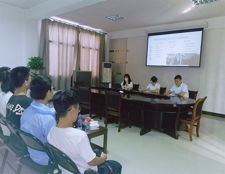 Mr. Li emphasized, "Fumin Machinery, as a 30-year-old company and an important display window of China's ceramic machinery industry, has the obligation and responsibility to continuously devote itself to the development of the ceramics and ceramic machinery industry." At the symposium, Mr. Li The current star product "Automatic Roll Forming Drying Production Line" of Fumin Machinery in the daily ceramic industry is introduced in detail, and the current high-efficiency and energy-saving automatic production line of Fumin Machinery is also introduced: centralized oil supply type ceramic plunger pump set, Centralized oil supply type ceramic plunger pump set, hydraulic filter press automatic line, etc. Finally, Mr. Li also said, "Ceramic machinery enterprises need to resonate with the national major strategies at the same frequency, and the ceramic machinery industry needs to actively move closer to Industry 4.0 and Made in China 2025." At the symposium, the students spoke enthusiastically and raised many questions about ceramic automation. Peng Gong and Manager Jiang answered the questions raised by the students one by one. After the meeting, the research team also visited the production workshop to understand the production process of mechanical equipment on the spot.